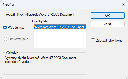 Otevře vložený objekt jako typ vybraný v poli Typ objektu a po editaci objekt vrátí na původní typ.