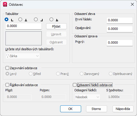 Zobrazí volby tabulátoru včetně možností přidávání a odstranění. Možné tabulátory jsou levý, střed, pravý a desetinný. Tabulátory lze také nastavit tlačítkem Výběr tabulátoru na pravítku Editoru na místě.