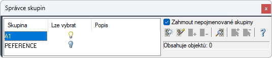 Když je skupina nevybíratelná, ikona žárovky není dostupná a výběrem jednoho prvku skupiny vyberete pouze daný objekt. Pokud je systémová proměnná PICKSTYLE nastavena na hodnotu 0, nebudete moci žádnou skupinu vybrat.