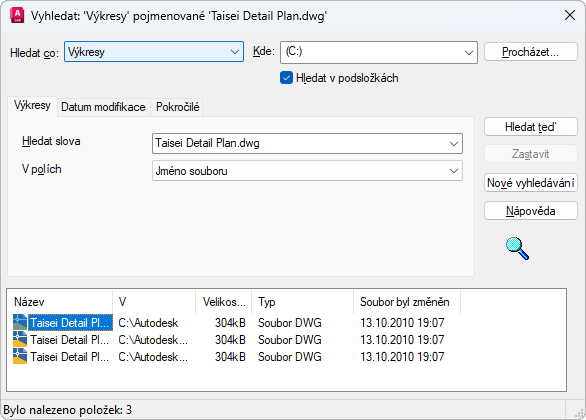 Najde obsah ve výkresech. Tato karta je dostupná, pouze pokud zvolíte v seznamu Hledat co položku Výkresy.
