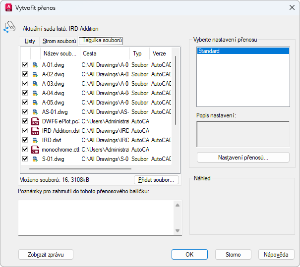 Implicitně jsou všechny soubory spojené s aktuálním výkresem (jako jsou externí reference, styly vykreslování a písma) uvedeny v seznamu. Do přenosu můžete přidat soubory nebo existující odstranit. Soubory, které jsou odkazovány prostřednictvím URL, nejsou do přenosu zahrnuty.