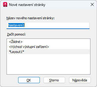 Určuje nastavení stránky, které bude použito pro zahájení tvorby nového nastavení stránky. Pokud kliknete na OK, zobrazí se dialog Nastavení stránky s nastaveními vybrané stránky, která můžete podle potřeby upravit.