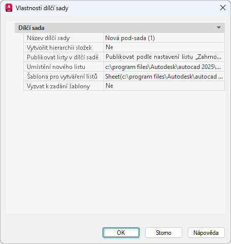 Určuje umístění složky všech nových výkresových souborů DWG, které obsahují listy asociované s touto pod-sadou.
