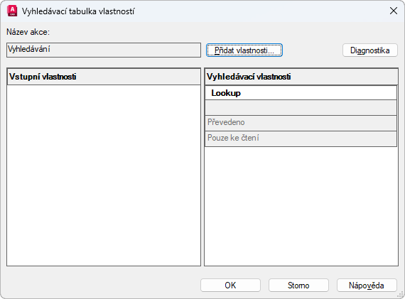 Vyhledávací tabulka přiřadí hodnoty uživatelských vlastností k referenci dynamického bloku. Pokud je pro vyhledávací vlastnost vybrána možnost Zpětné vyhledávání, reference bloku zobrazí vyhledávací uzel se seznamem vlastností, které mění zobrazení reference dynamického bloku.