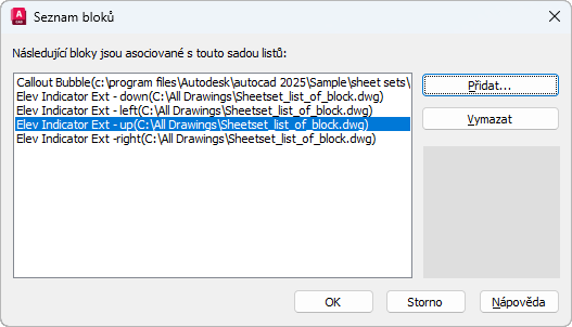 Můžete zde zobrazit seznam, přidat nebo odstranit odkazovací bloky pro použití v aktuální sadě listů.