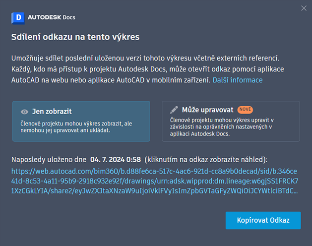 Každý uživatel s přístupem k projektu Autodesk Docs může odkaz otevřít pomocí aplikace AutoCAD na webu (web.autocad.com) nebo pomocí aplikace AutoCAD v mobilním zařízení. Kopírování propojení vytvoří odkaz na poslední uloženou verzi výkresu. Pro příjemce můžete vybrat mezi dvěma úrovněmi oprávnění: Jen zobrazit a Může upravovat.