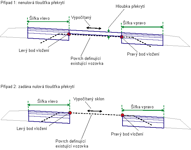 Jsou určeny výšky levého a pravého bodu vložení na existujícím povrchu a vypočte se sklon mezi dvěma body. Jestliže se zadá nenulová Hloubka překrytí, vrstva překrytí se přidá nad existující pruh s vypočteným sklonem. Uzavřený tvar překrytí se vytvoří překrytím jedné nebo více spojnic nad existujícím spádem. Rozšiřující pruhy se vloží směrem od hran překrytí pro danou šířku s vypočteným sklonem.