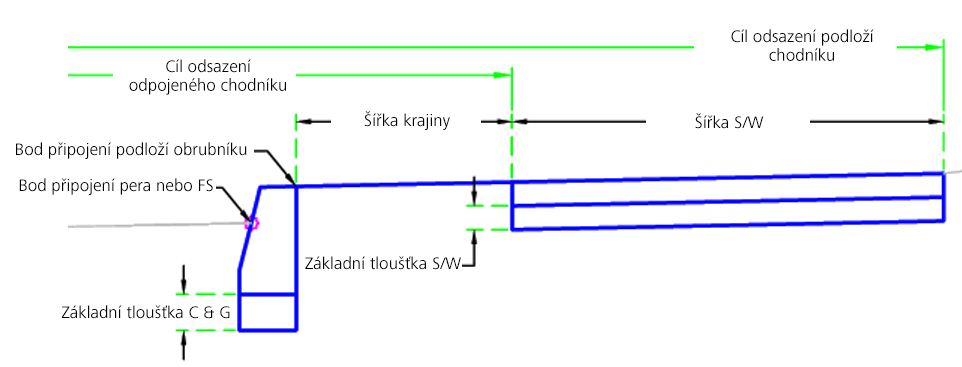 | Odsazení odděleného chodníku | Může se použít k přepsání pevné šířky chodníku a k navázání vnitřní hrany chodníku na trasu odsazení. Jako cíle pro určení šířky lze použít následující typy objektů: trasy, křivky, návrhové linie nebo polygony zaměření. | Volitelné |
