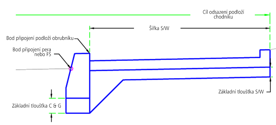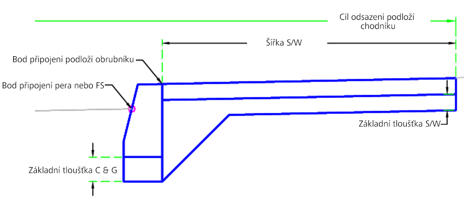 | Odsazení zadní části chodníku | Může se použít k přepsání pevné šířky chodníku a k navázání vnější hrany chodníku na trasu odsazení. Jako cíle pro určení šířky lze použít následující typy objektů: trasy, křivky, návrhové linie nebo polygony zaměření. | Volitelný |