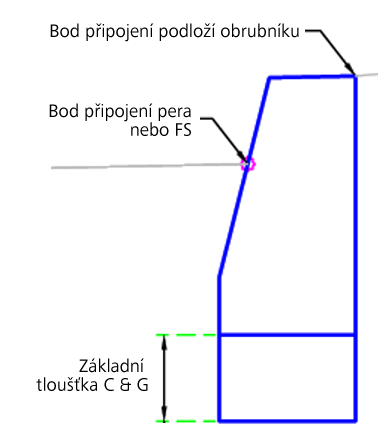 | Základní tloušťka C & G | Tloušťka základny pod obrubníkem a rigolem | Numerický, kladný |