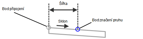 Spojnice se přidá z bodu připojení do zadané šířky a sklonu na zadané straně. Šířka spojnice je určena vynásobením parametru Šířka jízdního pruhu a parametru Umístění značky jízdního pruhu. Na druhém konci spojnice se přidá bod se zadaným kódem.