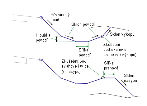 V režimu návrhu tato podsestava nakreslí přivrácený spád,boční svahy povodí a spodek povodí podle zadaných hodnot vstupních parametrů. Spojnice pro podmínku výkopu i násypu se zobrazí přerušovanou čárou společně se spojnicemi linie paty svahu směrem ven v délce 3 metry nebo 10 stop v daných sklonech. Spojnice linie paty svahu jsou ukončeny šipkami, které směřují ven.