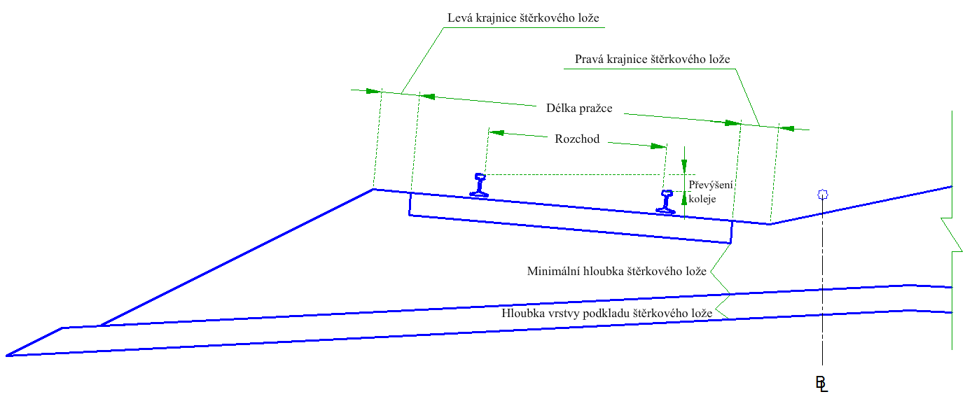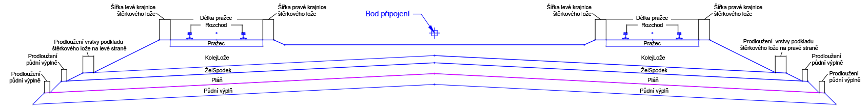 V režimu návrhu tato podsestava zobrazí spojnice tvořící kolejnice, pražce, štěrkové lože, podklad štěrkového lože a sklony bočních stran.