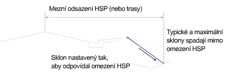 Jestliže typický sklon nespadá do hranic silničního pozemku, použije se strmější sklon. Pokud ani strmější sklon nespadá do hranic silničního pozemku, může uživatel využít možnosti pro ovládání chování.