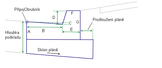 Spojnice obrubníku a rigolu se vloží na základě kót vstupních parametrů (Kóta A – Kóta F). Všechny kóty musí být kladné nenulové hodnoty. Jestliže se zadá nenulová hloubka podkladu, ochranná vrstva se vloží do podloží obrubníku a pokračuje na hodnotu šířky Prodloužení Pláně. Ochranná vrstva uzavírá spodní část podloží obrubníku tak, jak je uvedeno v diagramu.