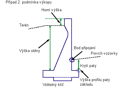 V podmínce násypu směřuje ploška stěny se sklonem proti středu vozovky. V podmínce výkopu směřuje ploška stěny se sklonem od vozovky proti zadržované zemi. Jestliže je možnost Klín nastavena na Ne, pak základna paty je jednoduchá horizontální spojnice. Pokud se použije možnost Klín, vytvoří se spojnice definující volitelný klín.