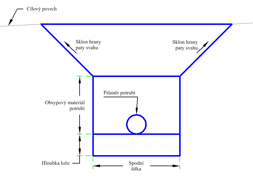 Výška spodní strany příkopu je vypočítána jako rozdíl výšky navrženého profilu a součtu poloviny průměru potrubí a hloubky podsypu. Horizontální spojnice spodní strany příkopu je umístěna symetricky kolem odsazení bodu připojení v dané výšce. Hloubka obsypového materiálu potrubí slouží k zajištění materiálu kolem potrubí. Sklony bočních stran vedou nahoru k existujícímu povrchu. Horizontální spojnice podsypu je umístěna v dané hloubce nad spodní stranou příkopu.
