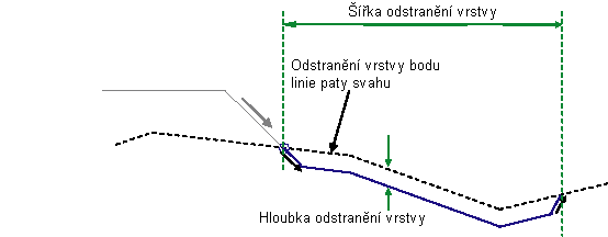 Tato podsestava vloží rovnoběžné spojnice definující spodek odstraňované vrstvy pod zadaným povrchem. Odstraňování začíná v bodu vložení přímo pod zadaným povrchem. Spojnice přivráceného spádu je umístěna od bodu vložení na stranu definovanou vstupními parametry. Tato spojnice se nakreslí tak, dokud není rozdíl výšek mezi jejím nejnižším bodem a existujícím terénem roven hloubce odstraňování.
