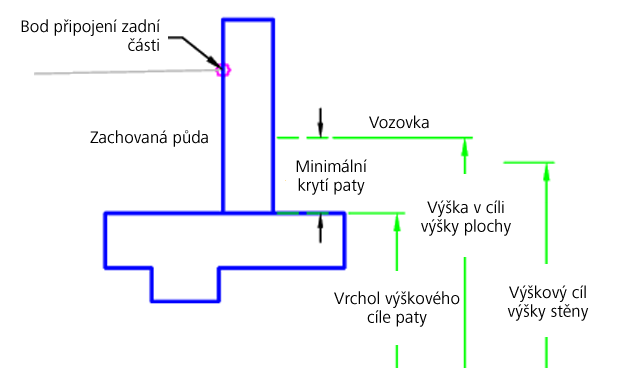 | Horní část paty | Může se použít k ovládání horní výšky paty. Jako cíle lze pro určení výšky použít následující typy objektů: profily, 3D křivky, návrhové linie nebo polygony zaměření. | Požadováno |