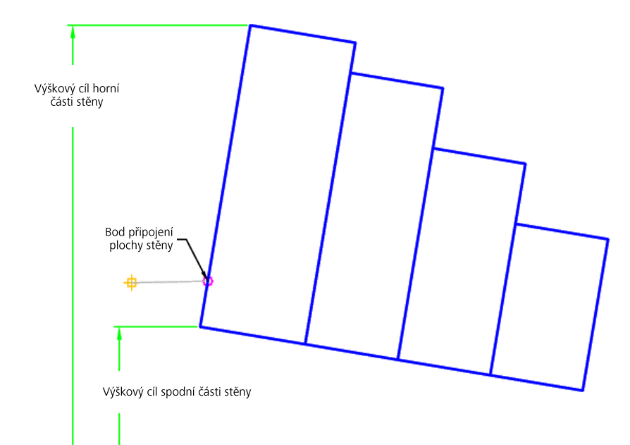 | Horní část stěny | Může se použít k nastavení výšky horní části zdi. Jako cíle lze pro určení výšky použít následující typy objektů: profily, 3D křivky, návrhové linie nebo polygony zaměření. | Volitelné (bod připojení = plocha zdi) |