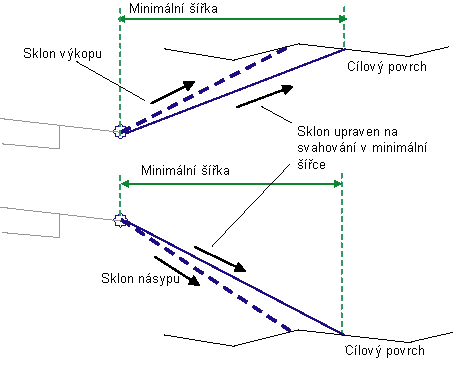 Je-li potřeba, spojnice se upraví tak, aby bod linie paty svahu byl v rámci minimální šířky od bodu počátku svahování.
