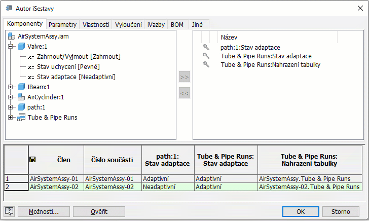 - Po vyplnění všech dalších vlastností iSestavy aplikace Inventor klikněte na tlačítko Ověřit k potvrzení konfigurace této sestavy. Člen sestavy primárních vedení může být například v rodině iSestav adaptivní pouze jednou a sloupec KS rozpisky může obsahovat pouze číslo nebo řetězec Výchozí.