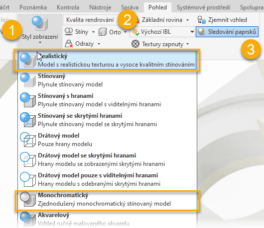 - Sledování paprsků je k dispozici pouze pro realistický a monochromatický vizuální styl.