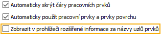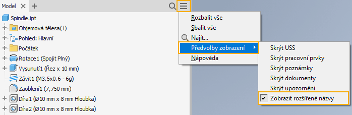 Možnosti Zobrazit v prohlížeči rozšířené informace za názvy uzlů prvků (k dispozici v dialogu Možnosti aplikace na kartě Součásti) a Zobrazit rozšířený název (k dispozici v nabídce nástroje v prohlížeči modelu) byly rozšířeny o podporu následujících příkazů: