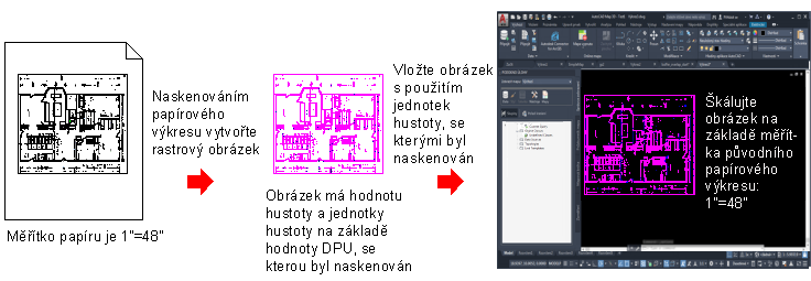 Obrázek v následujícím příkladu byl nakreslen v měřítku 1" = 48", naskenován s rozlišením 300 bodů na palec a vložen do výkresu s hodnotou hustoty 300 a jednotkou hustoty Palce. Potom bylo změněno měřítko na základě měřítka na papíru 1" = 48".