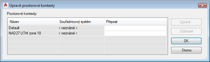 - Klikněte na tlačítko Upravit souřadnicové systémy a v dialogu Upravit prostorové kontexty klikněte na příslušnou položku.