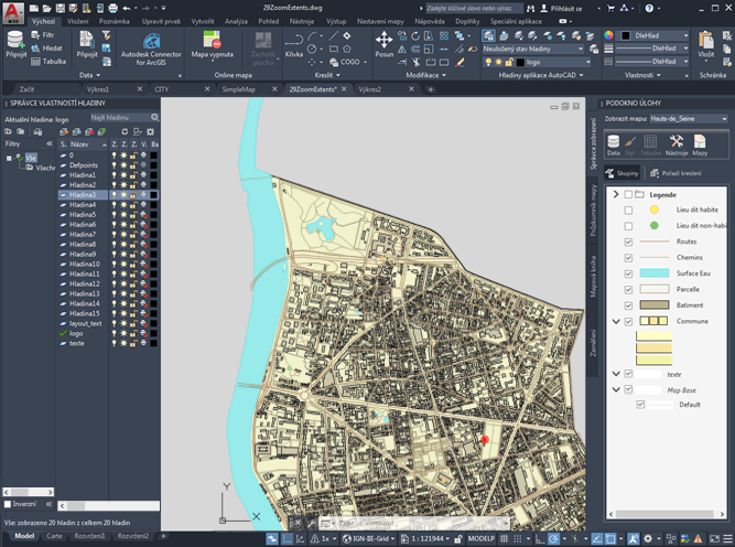 Tato mapa obsahuje hladiny aplikace AutoCAD (vlevo) a hladiny Správce zobrazení (vpravo).