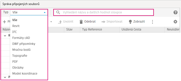 K zobrazení jednotlivých typů použijte filtr a k vyhledání připojených souborů funkci vyhledávání.