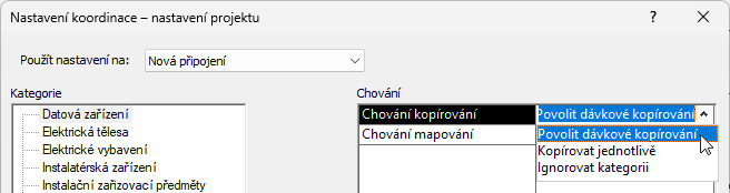 Před nebo při kopírování příslušenství z připojeného modelu do modelu aplikace MEP určete pro každou kategorii příslušenství chování kopírování v dialogu Určení nastavení koordinace.
