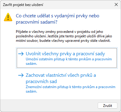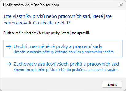 - Kliknutím na možnost Zachovat vlastnictví všech prvků a pracovních sad si ponecháte ve vlastnictví vypůjčené prvky a svoje pracovní sady. Vámi provedené změny budou ztraceny.