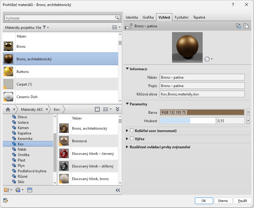 Dialog Prohlížeč materiálů použijte k vyhledání a správě materiálů pro prvky.