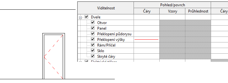 Pomocí podkategorií stylu objektu můžete ovládat viditelnost a zobrazení částí rodiny v rámci kategorie. Podkategorie například ovládá viditelnost otevírání dveří v bokorysném pohledu. Na obrázku níže je podkategorie Překlopení výšky přepsána tak, aby byla použita červená čára.