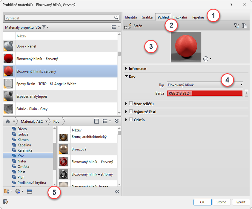 | 4 | Panel Vlastnosti: Slouží k zobrazení a správě detailních vlastností vybrané položky. Název a popis položky se zobrazí pod rozevíracím panelem informací. Výše uvedený příklad zobrazuje vlastnosti kovu zobrazené (rozbalené) pro položku vzhledu Eloxovaná – červená. Sadu vlastností, které se zobrazují například pro kapalinu, se liší od sad vlastností zobrazených pro plech. |
