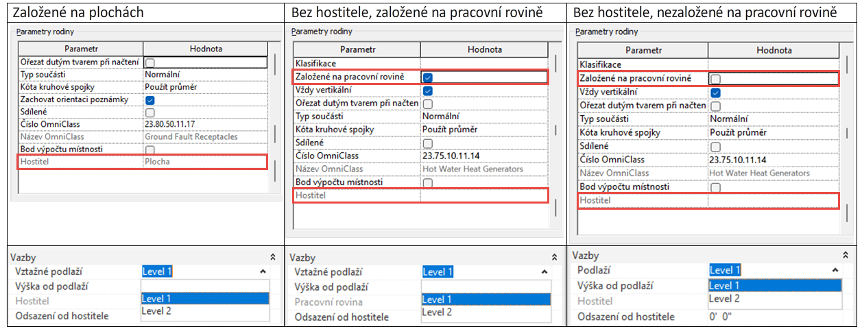 Definice obsahu také ovlivní, jaká vlastnost související s úrovní je dostupná. Hodnota vlastnosti na úrovni výkazu existuje u prvků založených na plochách a u prvků bez hostitele založených na pracovní rovině. Prvky bez hostitele nezaložené na pracovní rovině nemají vlastnost Úroveň výkazu. Místo ní mají vlastnost Úroveň, jak je shrnuto v následující tabulce: