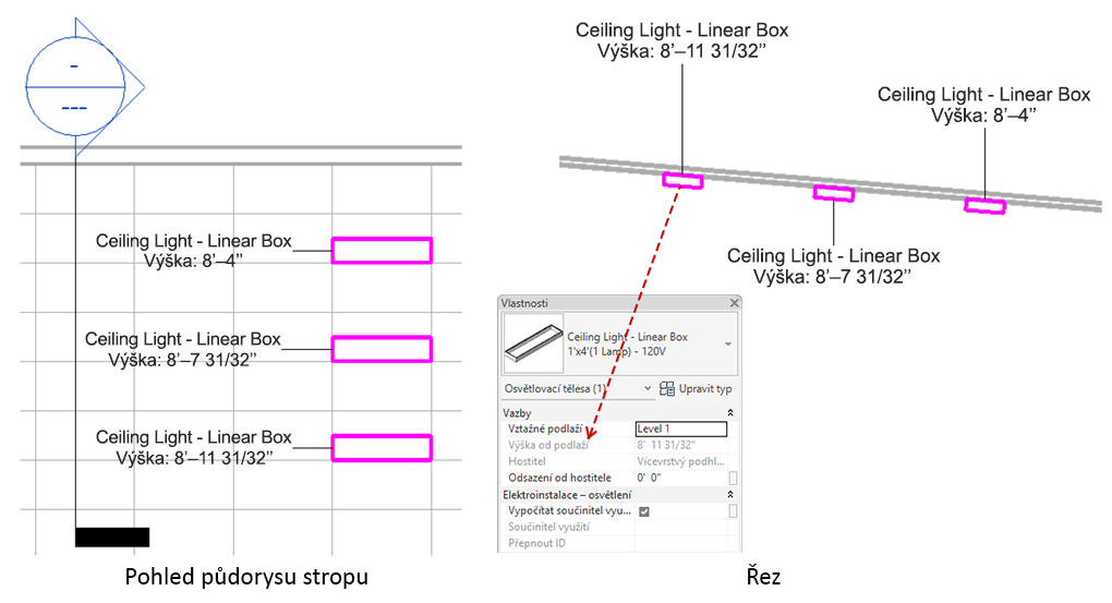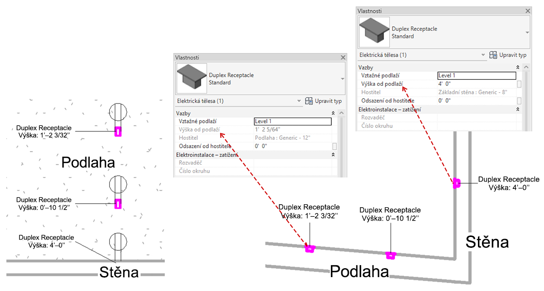 Parametr Výška od úrovně není možné upravit, pokud je prvek umístěn na jiném než vertikálním povrchu, například v případě, kdy je zásuvka umístěna na podlaze nebo kdy je osvětlovací těleso umístěno na podhledu.