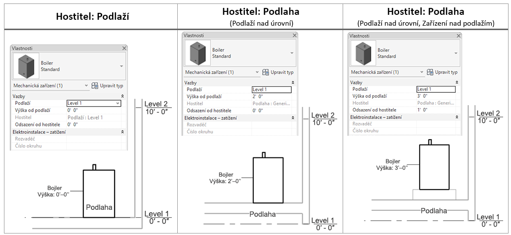 V níže uvedeném příkladu je podlaha ve výšce 2' 0" nad úrovní. Pokud je na podlahu umístěn kotel, hodnota parametru Výška od úrovně = 2' 0" a hodnota parametru Odsazení od hostitele = 0' 0".