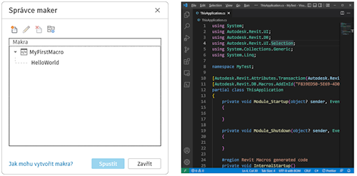 Kromě těchto rozšíření lze využít rozhraní API také k definování maker spuštěných v aplikaci Revit. Rozdíly rozhraní API budou vysvětleny dále; pro zkušené vývojáře je třeba podotknout, že makra není nutné registrovat v souboru Revit.ini nebo přidávat soubor RevitAPI.dll jako odkaz.