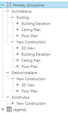 V Prohlížeči projektu jsou ve výchozím nastavení zobrazeny všechny pohledy (podle typu pohledu), všechny výkresy (podle čísla a názvu výkresu) a všechny výkazy a množství (podle názvu).