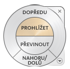 Prohlížení okolí a procházka modelem pomocí nástroje Prohlížet | Zobrazte velké kolečko Plná navigace. Klikněte na výseč Prohlédnout a podržte ji stisknutou. Směr svého pohledu ovládáte přetažením ukazatele. Se stisknutým tlačítkem polohovacího zařízení stiskněte klávesy se šipkami pro ovládání procházky modelem. Uvolněním tlačítka myši se vrátíte ke kolečku. Chcete-li toto kolečko ukončit, klikněte na tlačítko Zavřít. |