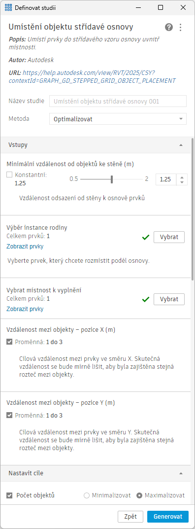 Pomocí možnosti Vytvořit studii vyberte typ studie a definujte cíle a kritéria studie. Potom kliknutím na tlačítko spustíte studii a vygenerujete alternativy návrhu. Během procesu generování můžete pokračovat v práci na modelu.