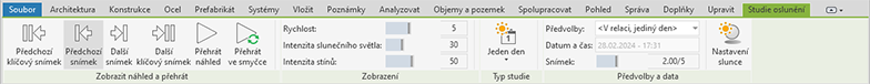 Předvolby a data: Ovládací prvky závisí na typu studie, pro kterou zobrazujete náhled. U typu studie Statický obrázek můžete vybrat aktuální předvolbu a nastavit aktuální datum a čas studie. U typů studií Jednotlivý den a Ve více dnech můžete vybrat aktuální předvolbu, zobrazit datum a čas aktuálního snímku a nastavit aktuální snímek studie. U typu studie Osvětlení můžete vybrat aktuální předvolbu a nastavit azimut a úhlovou výšku studie.