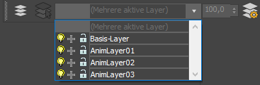 Mit der Funktion Animations-Layer können Sie mehrere Animationsspuren auf demselben Objekt kombinieren. Sie können verschiedene Animationen in Layern speichern, während Sie die Animationen ausprobieren, sie nach Belieben ein- oder ausschalten oder sie mit Gewichtungseinstellungen zusammenführen. In den meisten Fällen ist es am besten, diese Funktion über die Befehle im Werkzeugkasten "Animations-Layer" zu verwenden, die im Abschnitt "Benutzeroberfläche" in diesem Thema behandelt wird.