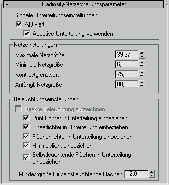 Ist "Adaptive Unterteilung verwenden" deaktiviert, wird im Feld "Max. Netzgröße" die Größe des Radiositäts-Netzes in Welteinheiten festgelegt.