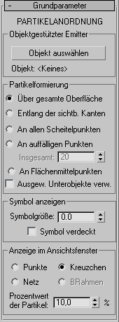 Mit den Optionen im Rollout "Grundparameter" können Sie ein Partikelsystem erstellen, seine Größe festlegen und ändern und das Verteilungsobjekt auswählen. Außerdem können Sie mit ihnen die ursprüngliche Verteilung der Partikel im Verhältnis zur Geometrie des Verteilungsobjekts sowie die Ausgangsgeschwindigkeit der Partikel vom Verteilungsobjekt weg festlegen. Hier können Sie auch angeben, wie die Partikel im Ansichtsfenster angezeigt werden sollen.