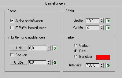 Auf der Registerkarte Einstellungen legen Sie die Größe und die Anzahl der Spitzen im Glanzlicht und die Okklusionseinstellungen fest und geben an, ob der Effekt Z-Puffer- oder Alpha-Kanäle beeinflusst.