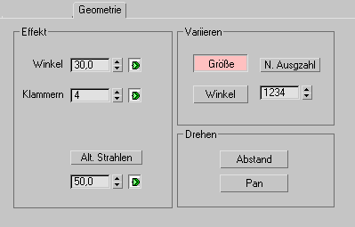 Auf der Registerkarte "Geometrie" legen Sie die Anfangsrotation der Glanzlichter fest und geben an, wie die Elemente im Zeitverlauf verändert werden. Die Registerkarte "Geometrie" umfasst drei Teile: "Effekt", "Variieren" und "Drehen".